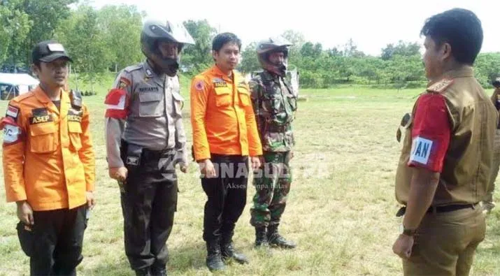 Kepala BPBD Konawe, Jahiudin (kanan) saat menerima laporan dari tim reaksi cepat ( TRC) pada acara Simulasi Bencana Banjir, Rabu (13/12/2017) (Dedy Finafiskar/ZONASULTRA.COM)