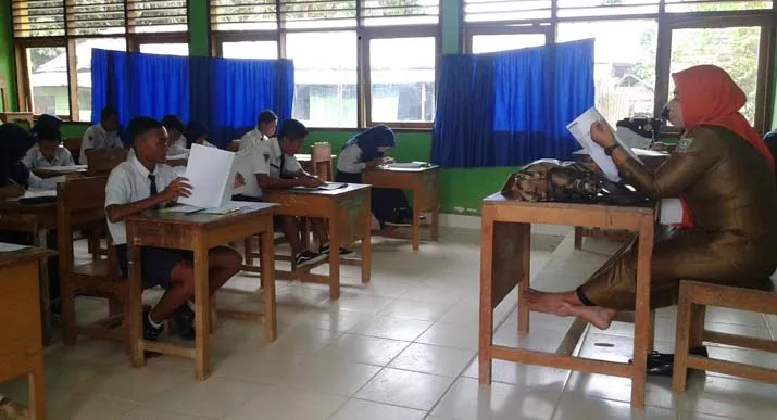 UJIAN NASIONAL-Terlihat siswa-siswi SMPN 1 Lasolo sedang melaksanakan pengisian soal ujian nasional (UN) dengan tenang dan teratur yang didampingi para pengawas, Selasa (2/5/2017). (Jefri/ZONASULTRA.COM)