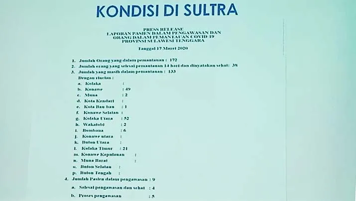“Ada juga yang berstatus pasien dalam pemantauan (PDP) 5 orang. Rata-rata mereka (ODP) baru pulang dari menjalankan umrah. Hasilnya sementara kita menunggu hasil laboratorium dari Makassar dan Jakarta. Kita berdoa semoga semua negatif. Amin,” jelas Andi Hasnah dalam pemaparannya saat rapat koordinasi di Mapolda Sultra, Rabu (18/3/2020).