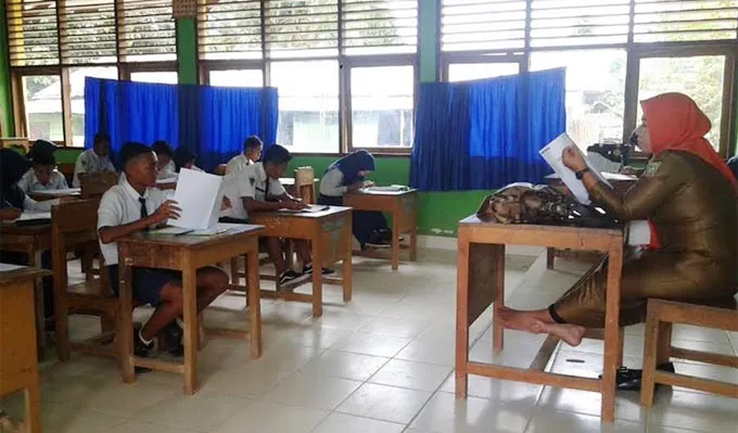 UJIAN NASIONAL – Terlihat siswa-siswi SMPN 1 Lasolo sedang melaksanakan pengisian soal ujian nasional (UN) dengan tenang dan teratur yang didampingi para pengawas. (Jefri/ZONASULTRA.COM).