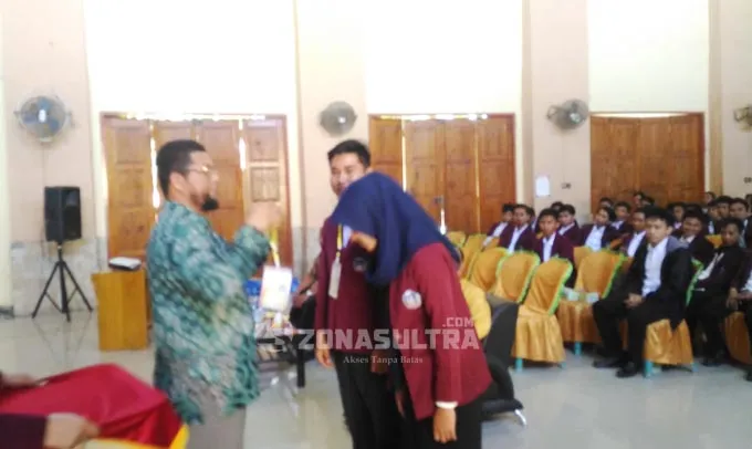 PEMBEKALAN PPL - Wakil Rektor Bidang Akademik USN Kolaka, Ruslin Hadanu secara simbolis melekatkan tanda kepesertaan PPL kepada mahasiswa FKIP di Auditorium USN Kolaka, Kamis (19/1/2017).(Abdul Saban/ZONASULTRA.COM)