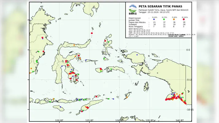 Sebaran ini merupakan pantauan satelit Terra, Aqua, dan Suomi NPP BMKG pada tanggal (25/11/2019) kemarin selama 24 jam.