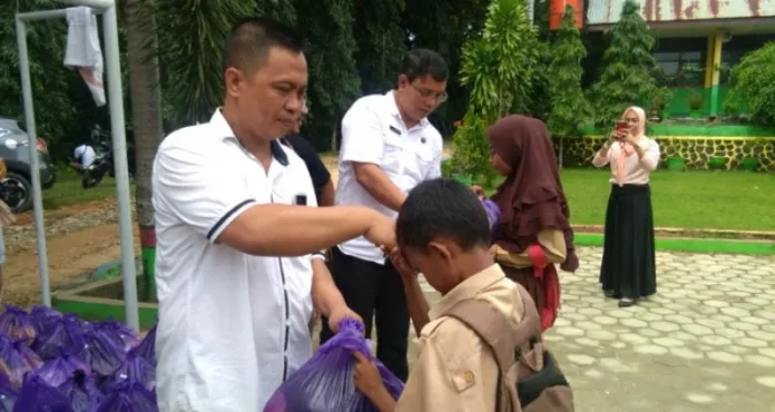 PENYERAHAN BANTUAN - Prosesi penyerahan bantuan sembako dari para alumni SMP Negeri 8 Kendari kepada 78 siswa kurang mampu di halaman sekolah, Sabtu (16/3/2019) (Fadly/ZONASULTRA.COM)