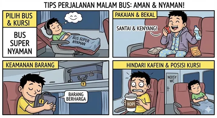 Memilih perjalanan malam dengan bus dapat memberikan kenyamanan tersendiri, tapi ada beberapa hal yang perlu diperhatikan agar perjalanan tetap lancar dan aman. Berikut ini adalah beberapa tips yang bisa membantu Anda dalam melakukan perjalanan naik bus di malam hari.