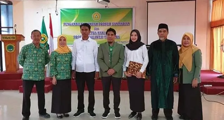 HALKI Sultra - Sebanyak 83 orang yang tergabung dalam Himpunan Ahli Kesehatan Lingkungan Indonesia (HALKI) Provinsi Sulawesi Tenggara (Sultra) menjalani sumpah profesi sebagai Sanitarian oleh ketua HALKI Sultra, Sultan Andi Bakri di Aula kampus Stikes Mandala Waluya Kendari, Kamis (17/10/2019). (Mardin/ZONASULTRA.COM)