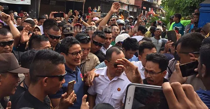 Satu orang diantara mereka terlihat mengalungkan bunga di leher Sandiaga. Dengan ciri khas gelang di tangan kanannya, Sandi terus menaikan dua jari ke arah kerumunan warga.