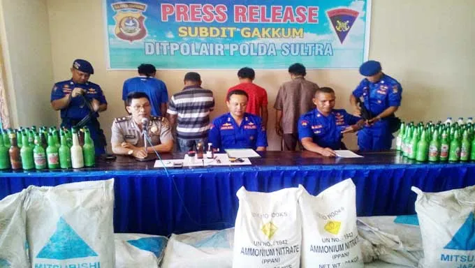 Kasubdit Gakkum Dit Polair Polda Sultra, AKBP Agus Budi didampingi Kasubdit PPID Polda Sultra, Kompol Dolfie Kumaseh mengatakan, kasus ini terkuak saat pihaknya berhasil mengamankan dua orang pelaku pada Minggu (2/10/2016) sekitar pukul 16.00 Wita. Dari tangan kedua pelaku pihaknya berhasil mengamankan barang bukti satu unit perahu tanpa nama, delapan karung ammonium nitrate, 102 botol handak siap ledak, serta 10 sumbu peledak dan 8 detonator.