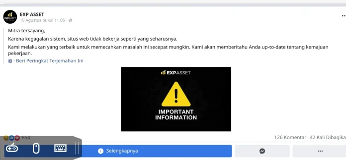 Pantauan zonasultra.id di akun Facebook Exp Asset pada 19 Agustus 2019 diumumkan kepada mitra Exp Asset bahwa situs web tidak berkerja sebagaimana mestinya karena kegagalan sistem.