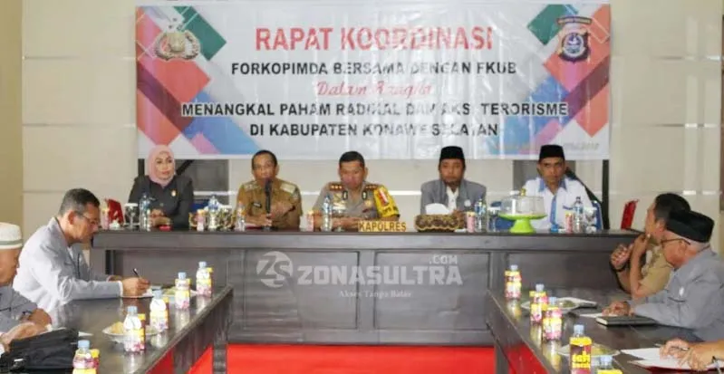 ZONASULTRA.COM, ANDOOLO – Polres Konawe Selatan (Konsel) Sulaweasi Tenggara (Sultra) bersama Pemerintah Daerah (Pemda), Selasa (15/5/2018) mengelar rapat koordinasi bersama dengan Forum Kerukunan Umat Beragama (FKUB) setempat, untuk menangkal paham radikal yang dapat masuk ke masyarakat. Kegiatan ini dimaksud untuk merespon aksi teror yang terjadi di Surabaya beberapa hari ini.