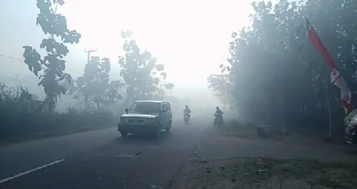 Ketebalan asap yang menimpa Kelurahan Lalolae juga sangat dirasakan oleh Sigit (29). Saking tebalnya asap, jarak pandangannya sangat terbatas.