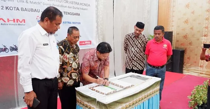 Memorandum of Understanding (MoU) antar keduanya diteken di aula SMK Negeri 2 Kota Baubau, Sulawesi Tenggara (Sultra), Rabu (14/8/2019). Lewat MoU itu disepakati, SMK Negeri 2 Kota Baubau jadi sekolah binaan Astra Motor Honda (AHM).