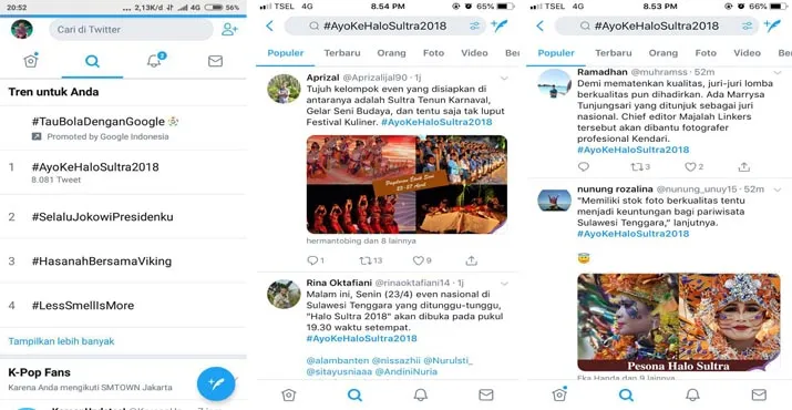 Salah satu akun Twitter @aprizalijal90 menuliskan pada Tweetnya “Tujuh kelompok even yang disiapkan di antaranya adalah Sultra Tenun Karnaval, Gelar Seni Budaya, dan tentu saja tak luput Festival Kuliner. #AyoKeHaloSultra2018,”