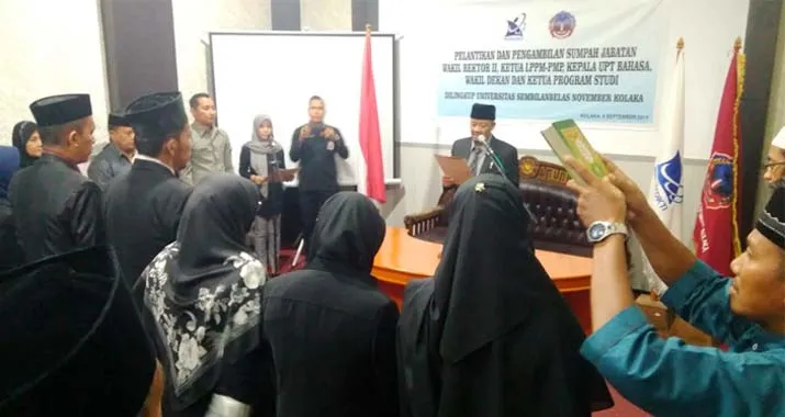 Pelantikan diawali penandatanganan surat keputusan dan dilanjutkan dengan pembacaan sumpah oleh Rektor USN Kolaka diikuti oleh seluruh pejabat yang dilantik.