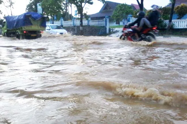 Kendari Mulai Banjir – Banjir terjadi di Jalan Abdullah Silondae, tepat di depan Kantor Badan Kepegawaian Daerah (BKD) Sulawesi Tenggara (Sultra), Selasa Sore (2/2/2016). Hujan yang cukup deras turun sekitar 1 jam lebih. Akibatnya aliran air di samping kiri Kantor BKD Sultra meluap dan merendam badan jalan hingga setinggi terotoar. Beberapa pengendara motor tampak mendorong motor mereka. Selain itu, beberapa kendaraan lainnya seperti mobil tampak berputar arah. (Muhamad Taslim Dalma/ZONASULTRA.COM)
