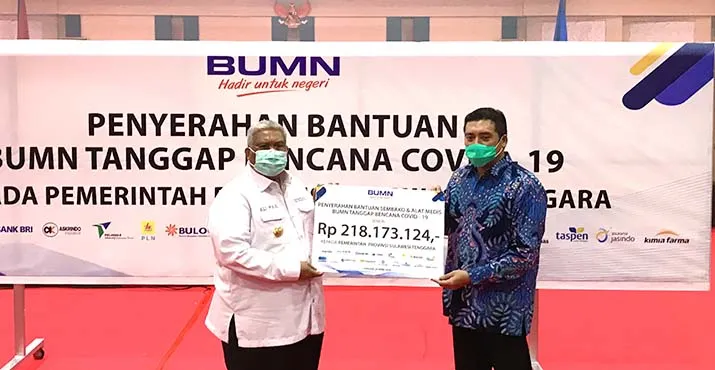 Penyerahan secara simbolis bantuan BUMN diterima langsung Gubenur Sultra Ali Mazi, Sabtu (25/4/2020) di Rumah Jabatan (Rujab) Gubernur yang dihadiri langsung oleh Wali Kota Kendari Sulkarnain, jajaran Forum Koordinasi Pimpinan Daerah (Forkopimda) Sultra, Kepala BPBD Provinsi Sultra Boy Ihwansyah dan pimpinan BUMN yang ada di Sultra, di antaranya Pimpinan BRI Sam Ratulangi Edy Muthalib, Branch Manager PT Taspen Kendari Fuji Widya Rachmadin dan Pimpinan BTN Kendari Erik Budi Setiawan.