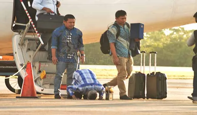 Walikota Baubau AS Tamrin Sujud syukur sesaat setelah tiba di Bandara Betoambari. Foto: Masrun