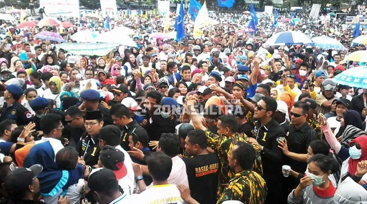 ZONASULTRA.COM, KENDARI – Pendukung dan simpatisan pasangan calon walikota Abdul Rasak – Haris Andi Surahman (Rasak-Haris) tumpah ruah di Lapangan Benu-Benua Kendari, Rabu (8/2/2017). Kedatangan mereka dalam rangka kampanye akbar yang hanya dilaksanakan satu kali.