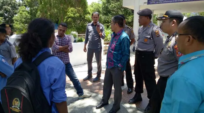 DEMO– Sejumlah masa KBM Sultra dan FORSUB Sultra saat mendatangi kantor Dinas Koordinasi Penanaman Modal Pelayanan Terpadu Satu Pintu (DKPM-PTSP) Provinsi Sultra untuk meminta keterangan pemda setempat perihal keberadaan PT. Jhonlin Batu Mandiri di Kabupaten Bombana yang dinilai melanggar aturan, Kamis (12/10/2017). (Foto :Istimewa)