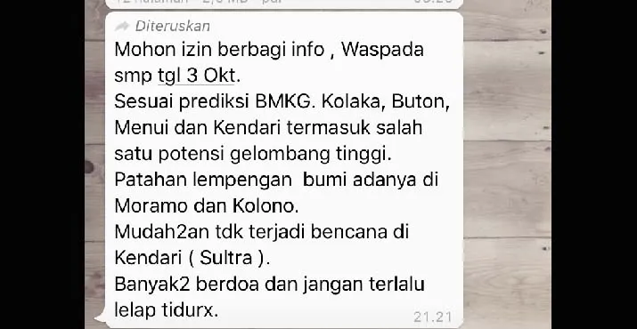 Pesan berantai peringatan gempa bumi dan tsunami ini dinilai Rosa sebagai imbas dari bencana gempa bumi dan tsunami yang menimpa palu, Jumat (28/9/2018) kemarin. Bukan hanya di Kendari, beberapa wilayah sekitar Palu, seperti Sulawesi Barat (Sulbar), Sulawesi Selatan (Sulsel) juga banyak menerima pesan berantai serupa. (B)