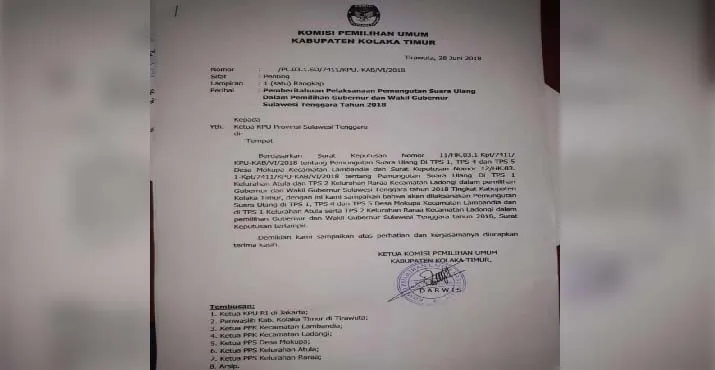 Surat itu bernomor 11 dan nomor 12/HK.03.1-Kpt/7411/KPU-KAB/VI/2018, tertanggal 28 Juni 2018. Surat tersebut ditandatangani oleh Ketua KPU Kolaka Timur, Darwis. Di atas tanda tangan juga terdapat stempel KPU Kolaka Timur.