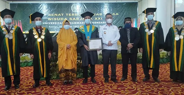 Lulusan terbaik tingkat universitas, Haspin program studi pendidikan Agama Islam, dengan IPK 3,94 masa studi 4 tahun 3 bulan di umumkan dalam Rapat Senat Terbuka Luar Biasa Wisuda Sarjana XXI Universitas Muhamadiyah Kendari yang di laksanakan di hotel Azizah Syariah Kendari, Sulawesi Tenggara (Sultra) pada Rabu (7/4/2021). (M11/ZONASULTRA.COM)