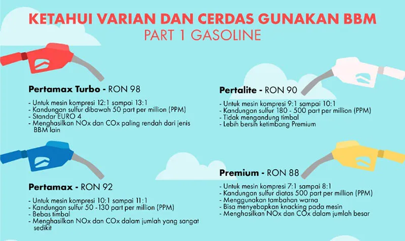 Perlu diketahui, jenis – jenis BBM yang disediakan Pertamina di SPBU beragam. Selain Premium, ada 3 varian lagi yang lebih tinggi tingkatannya untuk kelas mesin gasoline yaitu Pertalite dengan oktan 90, Pertamax dengan oktan 92 dan Pertamax Turbo dengan oktan 98 dengan perbedaan masing-masing.