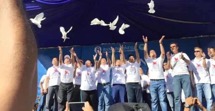 LAUCHING GPN - Pj Sekretaris Daerah Provinsi Sulawesi Tenggara (Sultra) Isma, Kepala KPw BI Sultra Minot Purwahono, Kepala OJK Sultra Muhammad Fredly Nasution bersama jajaran Kepala Cabang Perbankan yang ada di Sultra saat melepas burung merpati dalam acara Lauching kartu ATM/Debit berlogo GPN, Minggu (29/7/2018). (ILHAM SURAHMIN/ZONASULTRA.COM)