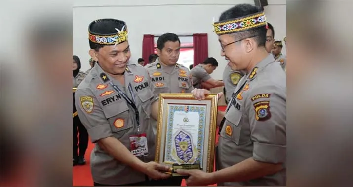 Penghargaan diberikan kepada As SDM Polto Irjen Pol Eko Indra Heri kepada kepala Karo SDM Polda Sultra Kombes Pol Sonny Mulvianto Utomo.