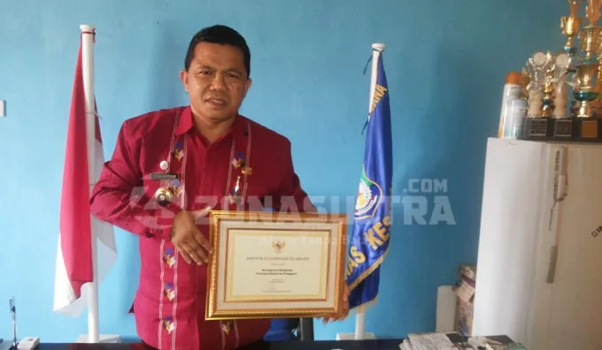 PIAGAM PENGHARGAAN – Kepala Dinas Kesehatan dan Keluarga Berencana Bombana Sunandar memperlihatkan piagam penghargaan nasional eliminasi filariasis, Jumat(7/10/2016). Piagam penghargaan tersebut diterima karena Bombana bebas dari penyakit kaki gajah. (Hasman/ZONASULTRA.COM)