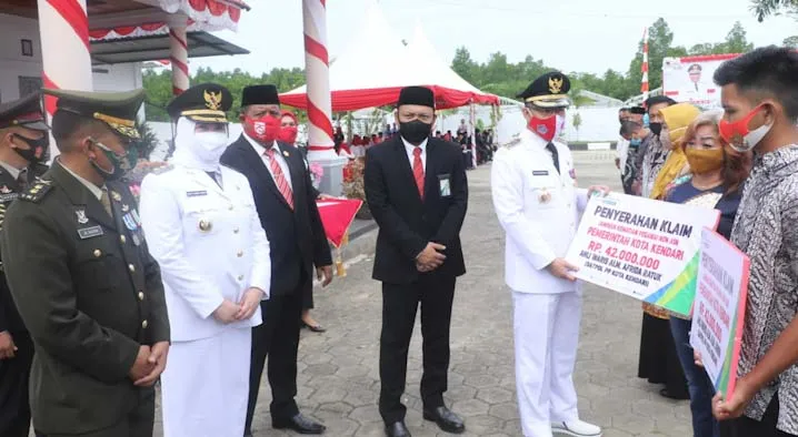 Penyerahan santunan tersebut diberikan secara simbolis oleh Wali Kota Kendari Sulkarnain didampingi Kepala BP Jamsostek Sultra Muhyiddin Dj usai pelaksanaan upacara HUT RI ke-75, Senin (17/8/2020) di Pelataran Rujab Wali Kota Kendari.