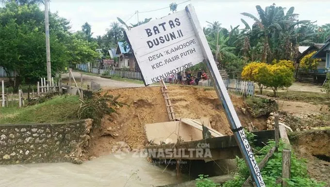 JEMBATAN AMBRUK – Jembatan Ambruk yang menghubungkan RT 01 dan 02 di Desa Kamosope Kecamatan Pasir Putih Kabupaten Muna akibat banjir yang terjadi pada pukul 05.00 wita dini hari, Minggu (28/5/2017) lalu. (Kasman/ZONASULTRA.COM)