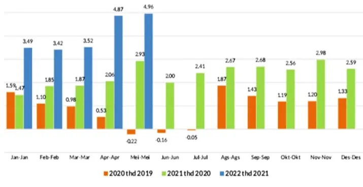 “Berdasarkan data dan pantauan BPS, tingkat inflasi tahun kalender (Januari-Mei) 2022 sebesar 3,53 persen dan tingkat inflasi tahun ke tahun (Mei 2022 terhadap Mei 2021) sebesar 4,96 persen,” ucap Agnes dalam rilis persnya pada Kamis (2/6/2022).