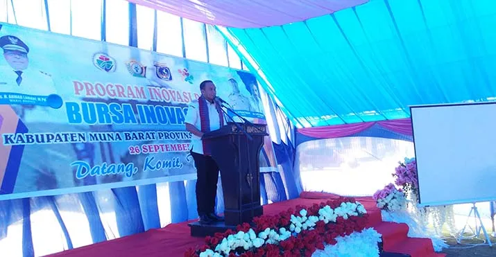 BURSA INOVASI DESA - Bupati Muna Barat LM Rajiun Tumada saat memberikan sambutan dan membuka secara resmi kegiatan bursa inovasi desa yang dilaksanakan di pelataran halaman Kantor Bupati Muna Barat, Rabu (26/9/2018). (Kasman/ZONASULTRA.COM)
