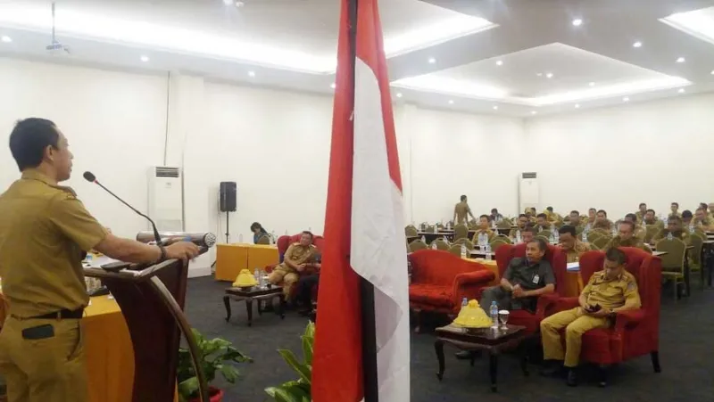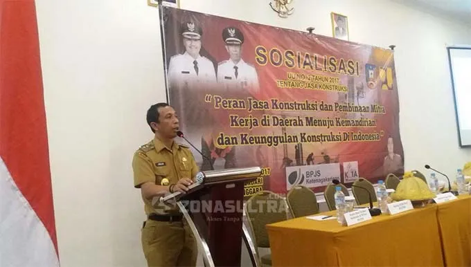 SIOSIALISASI – Wakil bupati Konawe Selatan (Konsel) Sulawesi Tenggara (Sultra) Arsalim Arifin membuka kegiatan sosialisasi UU No. 2 Tahun 2017 tentang Jasa Konstruksi yang diselenggarakan oleh Dinas Pekerjaan Umum dan Tata Ruang Pemerintah Daerah (Pemda) setempat, Senin (6/11/2017). (Erik Ari Prabowo/ZONASULTRA.COM)