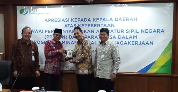 BPJS KETENAGAKERJAAN- Bupati Bombana Tafdil (kedua dari kiri) saat menerima penghargaan dari Direktur Kepesertaan BPJS Ketanagakerjaan Ilyas Lubis (kedua dari kanan) dalam acara apresiasi BPJS Ketenagakerjaan kepada Kepala Daerah yang aktif dalam mengimplementasikan program BPJS Ketenagakerjaan di masyarakat, Jumat (25/1/2019). DOKUMENTASI BPJS KETENAGAKERJAAN.