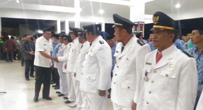 Bupati Kolaka, Ahmad Safei menyalami pejabat yang baru saja di pelantiknnya di Pendopo Rujab Bupati Kolaka, Sabtu (31/12/2016) malam. (Abdul Saban/ZONASULTRA.COM)