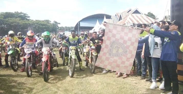 KEJUARAAN - Bupati Kolaka Timur (Koltim), Sulawesi Tenggara (Sultra), Tony Herbiansyah membuka kejuaraan one day trail adventure, di lapangan Latamoro,Kecamatan Tirawuta, Sabtu (12/10/2019). (Samrul/ZONASULTRA.COM)