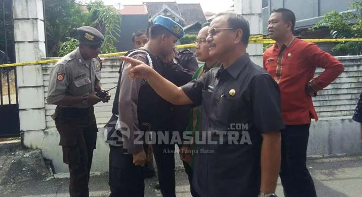 ZONASULTRA.COM, KENDARI – Bupati Konawe Selatan Surunuddin Dangga didampingi Sekretarisnya Syarif Sajang mendatangi rumah Walikota Kendari Asrun yang diduga dibom, Kamis (9/2/2017) pagi.