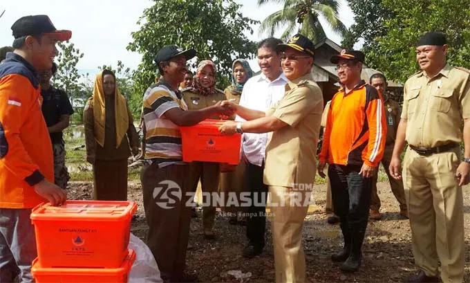 KORBAN BANJIR – Bupati Konsel saat memberikan bantuan pada masyarakat di Desa Lawoila, Kecamatan Konda, Kabupaten Konawe Selatan (Konsel), Sulawesi Tenggara (Sultra). Bantuan ini diserahkan kepada warga yang terdampak korban banjir sejak Jumat lalu, Senin (15/5/2017) (ERIK ARI PRABOWO/ZONASULTRA.COM)