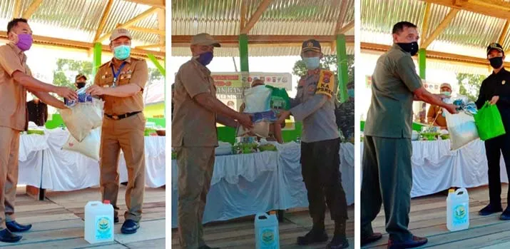 PENYALURAN SEMBAKO- Bupati Konut, Ruksamin bersama pihak pimpinan Polres Konut, TNI, dan DPRD saat menyalurkan paket sembako dan biosel kepada masyarakat Kecamatan Molawe.(Jefri/ZONASULTRA.COM)