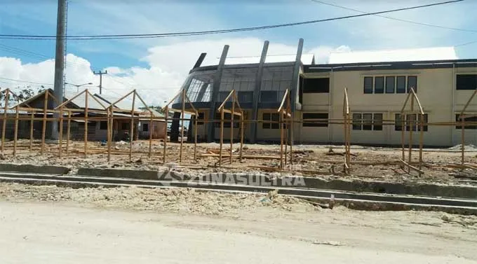 KIOS – Pembangunan kios-kios baru disekitar halaman pasar sentral laino yang sangat disesalkan Ketua Komisi II DPRD Kabupaten Muna La Samuri, saat meninjau pekerjaan pembangunan Pasar Sentral Laino. (Kasman/ZONASULTRA.COM).