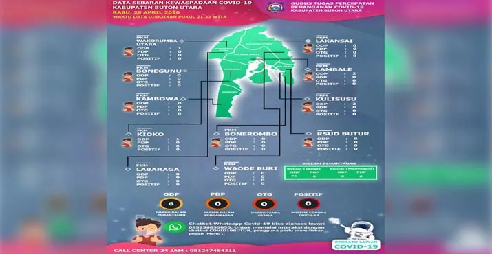 Total ODP di wilayah Buton Utara ada 82 orang , 72 di antaranya telah selesai masa pemantauan dan dinyatakan sehat. Saat ini terkonfirmasi 6 orang masih dalam pemantauan. (b)