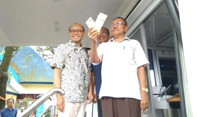 TUKAR UANG – Sekretaris Daerah (Sekda) Konawe H. Ridwam Lamaroa saat menunjukkan uang yang usai ia tukar di mobil layanan penukaran Bank Mandiri di Wawotobi, Sabtu (17/6/2017). Layanan penukaran uang ini dilakukan dalam rangka kegiatan Rupiah untuk Negeri. (Sitti Nurmalasari/ZONASULTRA.COM)