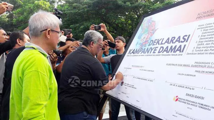 ZONASULTRA.COM, KENDARI – Sebanyak tiga pasangan calon Gubernur Dan Wakil Gubernur Sulawesi Tenggara (Sultra), mengikuti deklarasi damai di lapangan Eks MTQ Kendari, Minggu (18/2/2018).