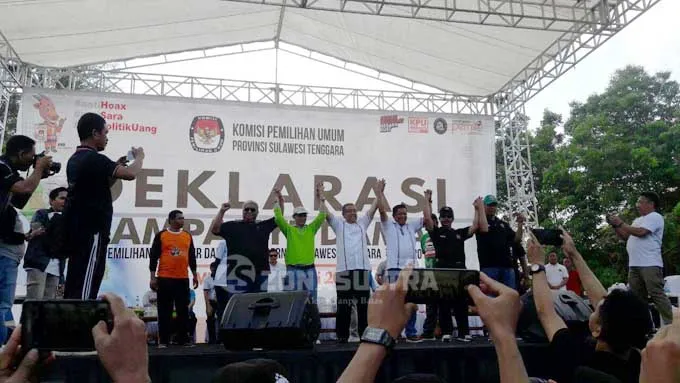 “Kita dilarang menghina seseorang, suku. Jangan menjanjikan uang atau materi untuk mempengaruhi pemilih. Terkait larangan ini jika ada paslon yang melanggar, akan dikenai pidana. Kalau politik uang, bisa dikenai pembatalan pasangan calon,” kata Ketua KPU Sultra Hidayatullah di lokasi deklarasi damai.
