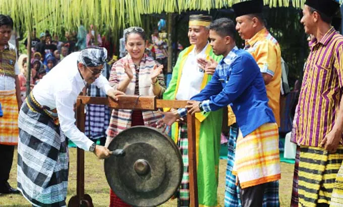 PERESMIAN - Pemukulan Gong oleh Sektetaris Daerah Kabupaten Wakatobi yang didampingi Wa Ode Hansina Bolu tanda peresmian ditetapkannya Desa Liya Togo sebagai Desa Wisata. (Nova Ely Surya/ZONASULTRA.COM)