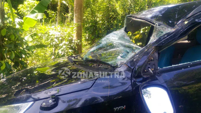 KECELAKAAN - Mobil ringsek karena mengalami kecelakaan tunggal di KM 24, Kelurahan Sabilambo, Kecamatan Kolaka, Senin (5/3/2018). (Ashar/ZONASULTRA.COM)
