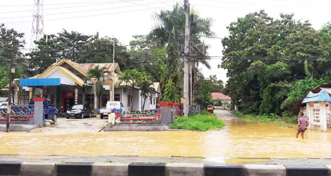 Selokan di dekat Masjid Nurul Jannah yang menjadi saluran drainase meluap dan tidak dapat terbendung sehingga menutup sebagian badan jalan yang menghubungkan Jalan Sao-sao dan Jalan By Pass.