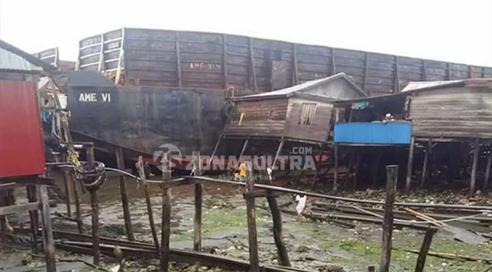 KAPAL TERDAMPAR – Tongkang AME VI milik perusahaan tambang PT TBS, mendarat di pesisir Pantai Sikeli Kecamatan Kabaena Barat Kab Bombana pasca dihantam gelombang tinggi pada Jumat (22/12/17). Kapal menghantam rumah warga dan membuat kapal nelayan serta karamba rusak. (TAHIR OSE/ZONASULTRA.COM)