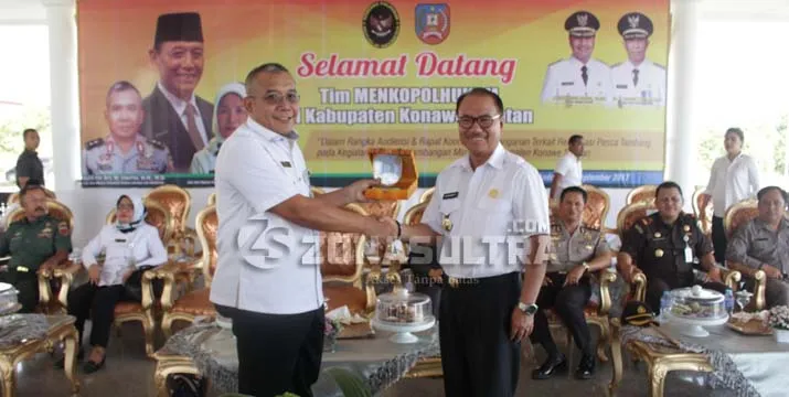 KONSEL – Bupati Konsel Surunuddin Dangga menyerahkan cendra mata kepada Staf Ahli Menko Polhukam bidang Ideologi dan Konstitusi Irjen Pol Muhamad Ghufron saat berkunjung ke daerah itu dalam rangka audiensi dan rakor terkait penaganan reklamasi pasca tambang pada kegiatan usaha pertambangan dan mineral, Rabu (6/9/2017). (Erik Ari Prabowo/ZONASULTRA.COM)